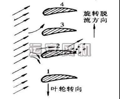 轴流风机叶片通常都是流线型的,设计工况下运行时,气流冲角(即进口气流相对速度w的方向与叶片安装角之差)约为零,气流阻力小,风机效率高。当风机流量减小时,w的方向角改变,气流冲角增大。当冲角增大到某一临界值时,叶背尾端产生涡流区,即所谓的脱流工况(失速),阻力急剧增加,而升力(压力)迅速降低;冲角再增大,脱流现象更为严重,甚至会出现部分叶道阻塞的情况。由于风机各叶片存在安装误差,安装角不完全一致,气流流场不均匀相等。因此,失速现象并不是所有叶片同时发生,而是首先在一个或几个叶片出现。若在叶道2中出现脱流,叶道由于受脱流区的排挤变窄,流量减小,则气流分别进入相邻的1、3叶道,使1、3叶道的气流方向改变。结果使流入叶道1的气流冲角减小,叶道1保持正常流动;叶道3的冲角增大,加剧了脱流和阻塞。叶道3的阻塞同理又影响相邻叶道2和4的气流,使叶道2消除脱硫,同时引发叶道4出现脱流。也就是说,脱流区是旋转的,其旋转方向与叶轮旋转方向相反。这种现象称为旋转失速。